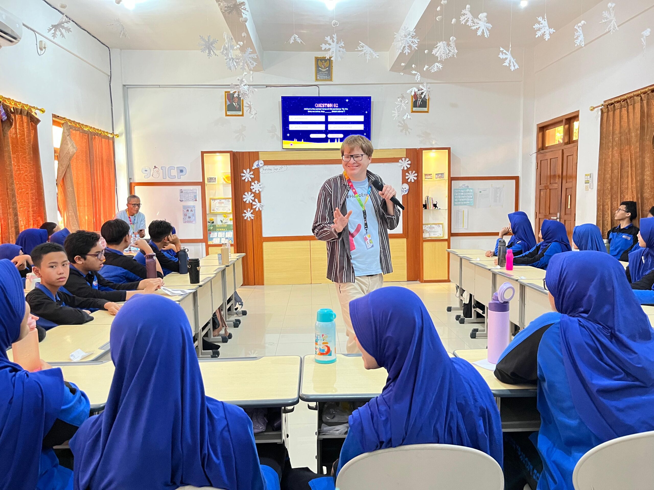Sementara itu, Native Speaker, Benjamin Paul Ellis, menyampaikan apresiasinya terhadap siswa SMP Muhammadiyah PK. Ia berbagi pengalaman belajar dengan siswa kelas 8 dan 9 International Class Program (ICP) melalui berbagai aktivitas interaktif, mulai dari kuis hingga diskusi topik seputar geografi, matematika, dan sains.