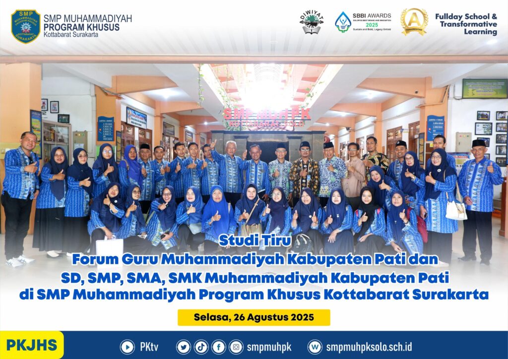 Guna meningkatkan kualitas pendidikan, SMP Muhammadiyah Program Khusus (PK) Kottabarat Surakarta kembali menjadi magnet bagi sekolah Muhammadiyah di luar daerah. Pada Selasa (27/8/2025), rombongan sejumlah 40 orang dari Majelis Dikdasmen PDM Kabupaten Pati yang terdiri dari unsur SD, MI, SMP, SMA, dan SMK Muhammadiyah melakukan studi tiru di sekolah ini.